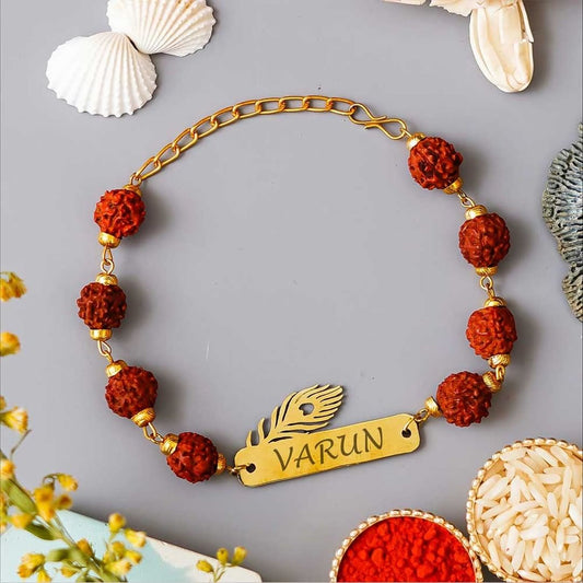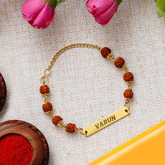 Customized Rudraksh Rakhi with Name – Personalized Brass Nameplate Rakhi for Brother – Traditional Raksha Bandhan Rakhi for Men