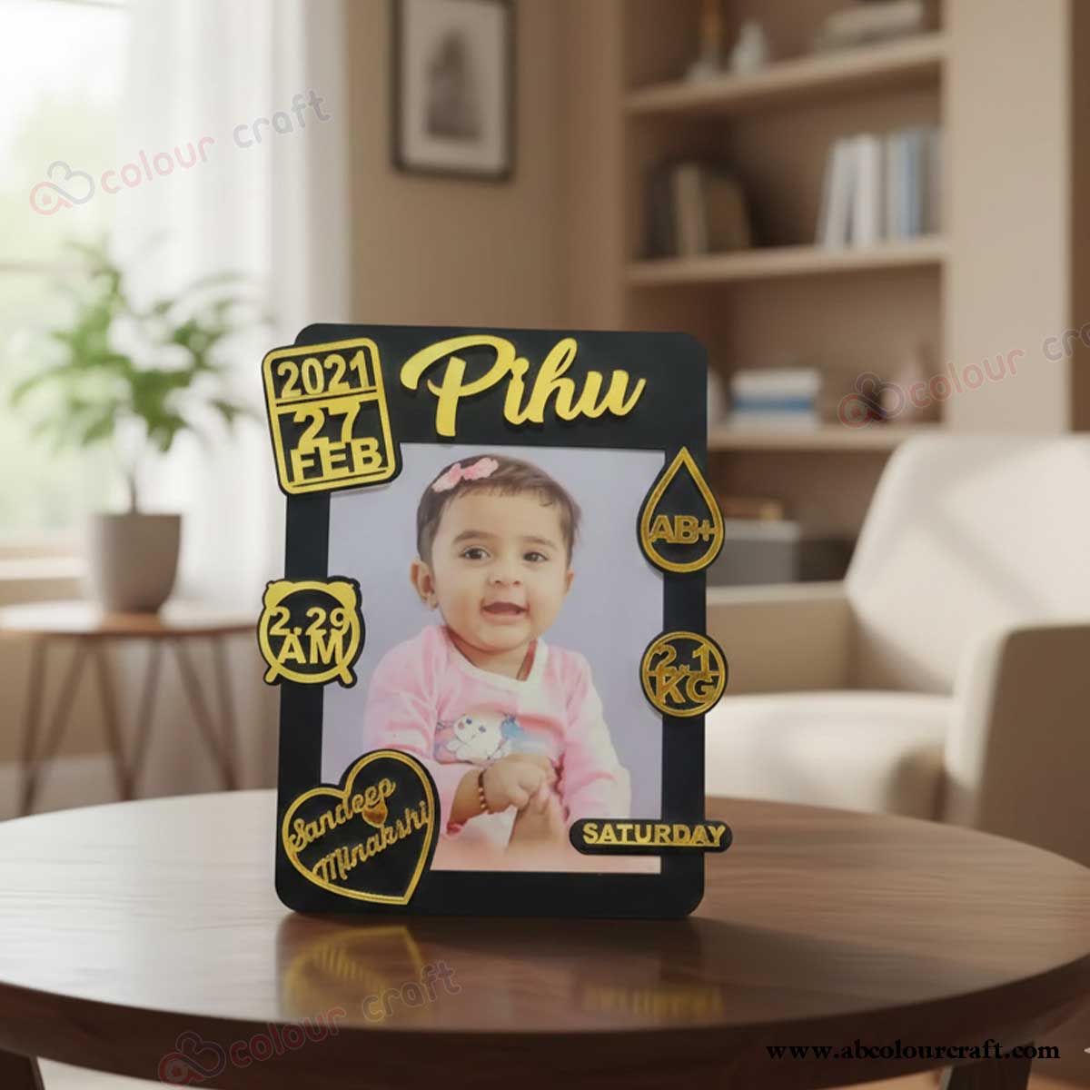 Crafted from high-quality MDF with a stunning acrylic name cutout and a high-quality photo print, this frame is the perfect centerpiece for a nursery or a cherished gift for new parents, grandparents, or a baby shower. Personalize it with the baby's name, date of birth, time, weight, blood group, hospital name, and parents' names (as seen in the images). Choose from various color finishes (like light wood/white, dark wood, or black) to match any decor.